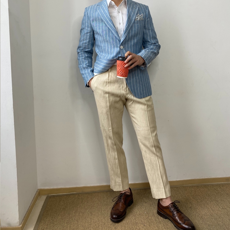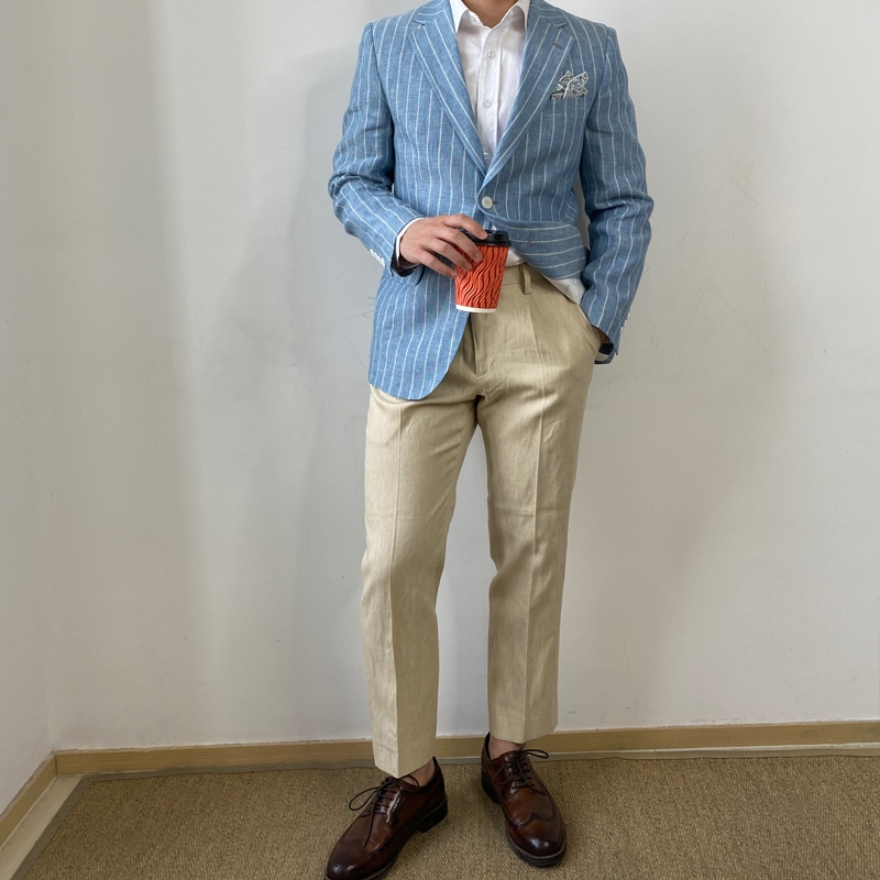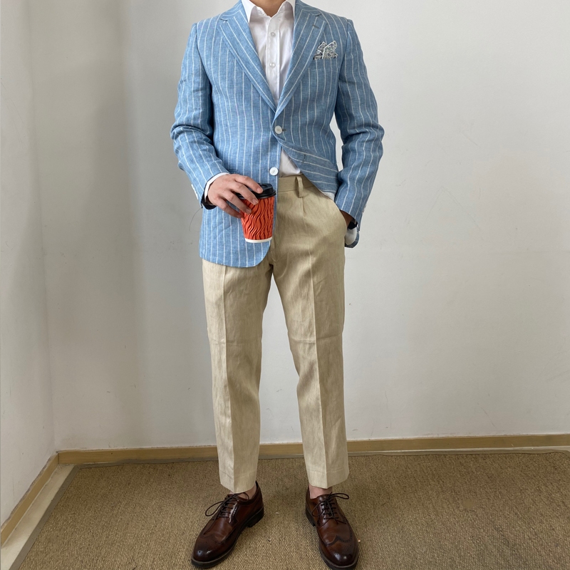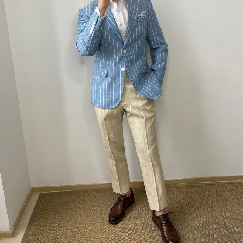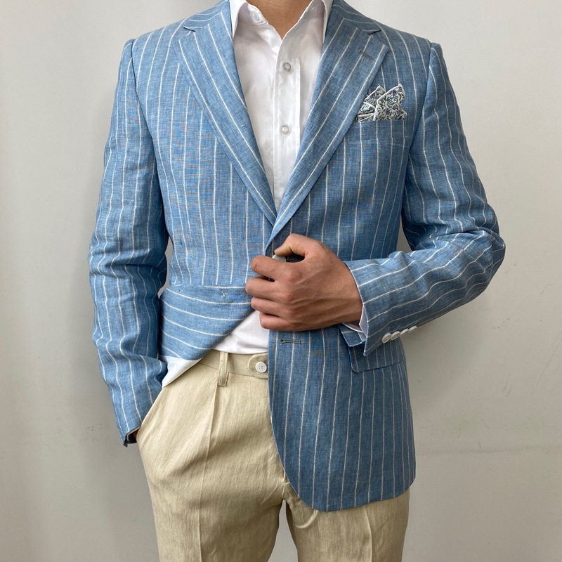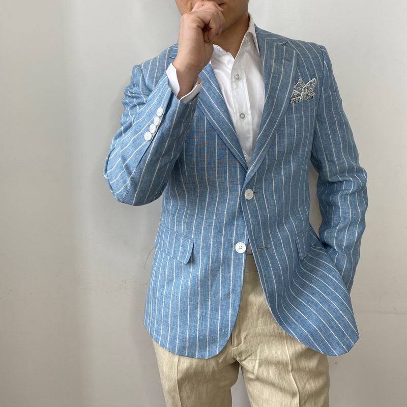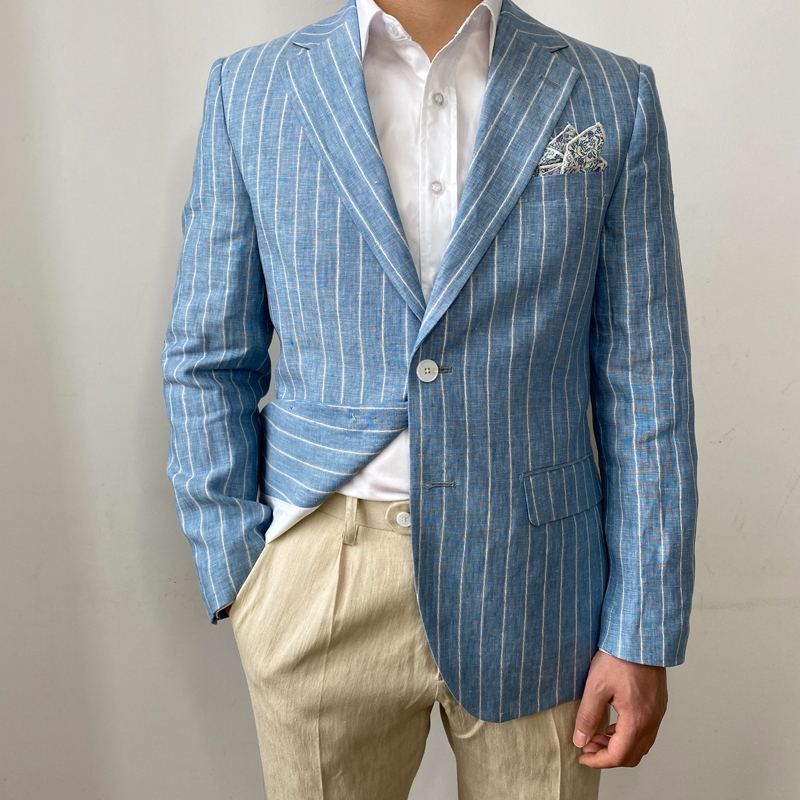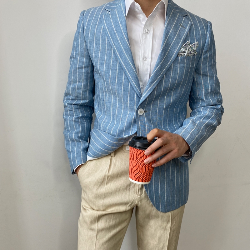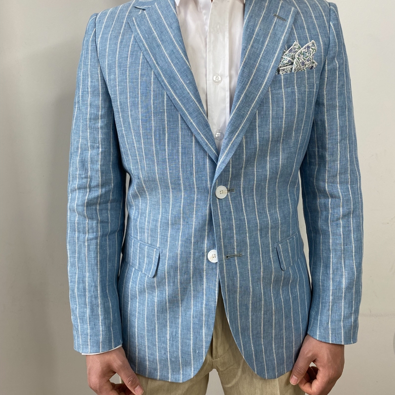 KIESSu蓝色条纹休闲亚麻西服上衣